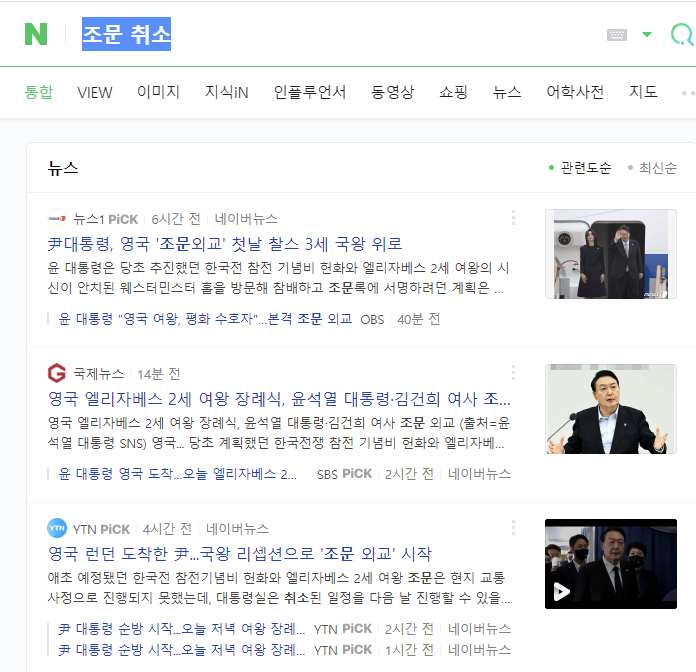 주요 선진국 정상들이 모두 참석한 영국 엘리자베스 여왕의 조문에 우리나라 윤석열 대통령과 김건희 여사가 도착 당일 조문 취소를 결정한 지금 상황