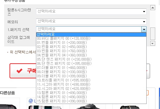 최저가 판매 상점의 대부분은 단품판매를 거부한체 위에 보이는 것과 같은 필수 악세서리 패키지 판매를 반 강제로 강요 합니다. 어차피 카메라를 쓸꺼면 꼭 필요한 악세서리이니 본체 살 때 같이사면 특별히 더 할인해 준다는 그럴 듯한 논리 입니다. 가장 기본패키지인 바디 풀페키지 판매가가 본체가격의 +12만원이네요.