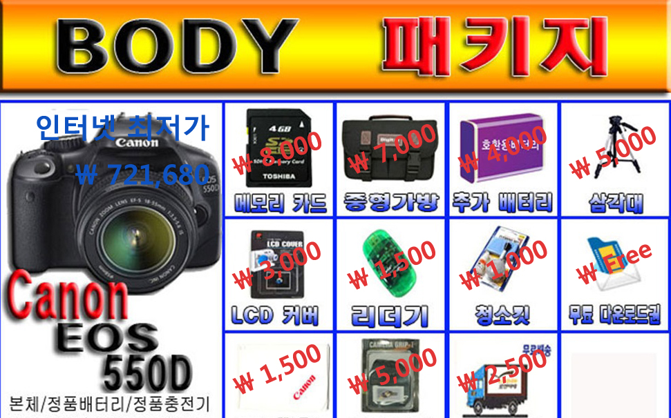 최저가 판매 상점의 대부분은 단품판매를 거부한체 위에 보이는 것과 같은 필수 악세서리 패키지 판매를 반 강제로 강요 합니다. 어차피 카메라를 쓸꺼면 꼭 필요한 악세서리이니 본체 살 때 같이사면 특별히 더 할인해 준다는 그럴 듯한 논리 입니다. 가장 기본패키지인 바디 풀페키지 판매가가 본체가격의 +12만원이네요.