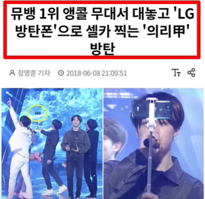 그런데 2010년 기사에서 SBS 인기가요가 국내 지상파 최초 간접광고 도입이라는 내용이 있습니다. 그렇다면 이미 오래전부터 이번 뉴진스가 논란이 되는 음악방송은 지속적으로 PPL 광고를 진행하고 있었던 것입니다. 기존 사례를 보면 방송에서 13초간 검색포털 광고를 노출한적도 있고 드러내놓고 브랜드 음료수를 등장시키기도 했습니다. 그리고 BTS는 이번 뉴진스 아이폰 PPL과 동일하게 LG 방탄 폰이라고 해서 셀카를 찍는 퍼포먼스를 뮤직뱅크에서 선보이기도 했습니다. BTS의 PPL이 뉴진스와 차이점이 있다면 본 무대가 아니라 앙코르 무대인 점뿐입니다.
