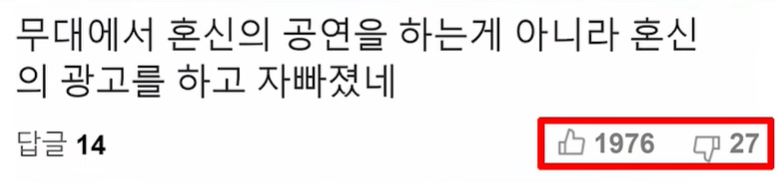 그렇다면 이 뉴진스 사건을 비난하는 사람들이 실제 있었을까요? 뉴진스 소식에 대한 베스트 댓글을 살펴보면 무대에서 혼신의 공연을 하는 게 아니라 혼신의 광고를 하고 자빠졌네라는 반응이 보입니다. 저 행동은 진짜 미친 거라는 반응도 있었고 심지어는 방송 출연을 금지해야 된다는 반응까지 있었습니다. 음악방송 중 아이폰 PPL을 진행한 뉴진스의 행동에 대한 비난 여론은 실제로 다수 발생했으며, 댓글 추천수를 보면 확인되는 부분이지만 그 반응을 바라보는 네티즌들 또한 대부분 비난 여론에 동조한 것을 알 수 있습니다.