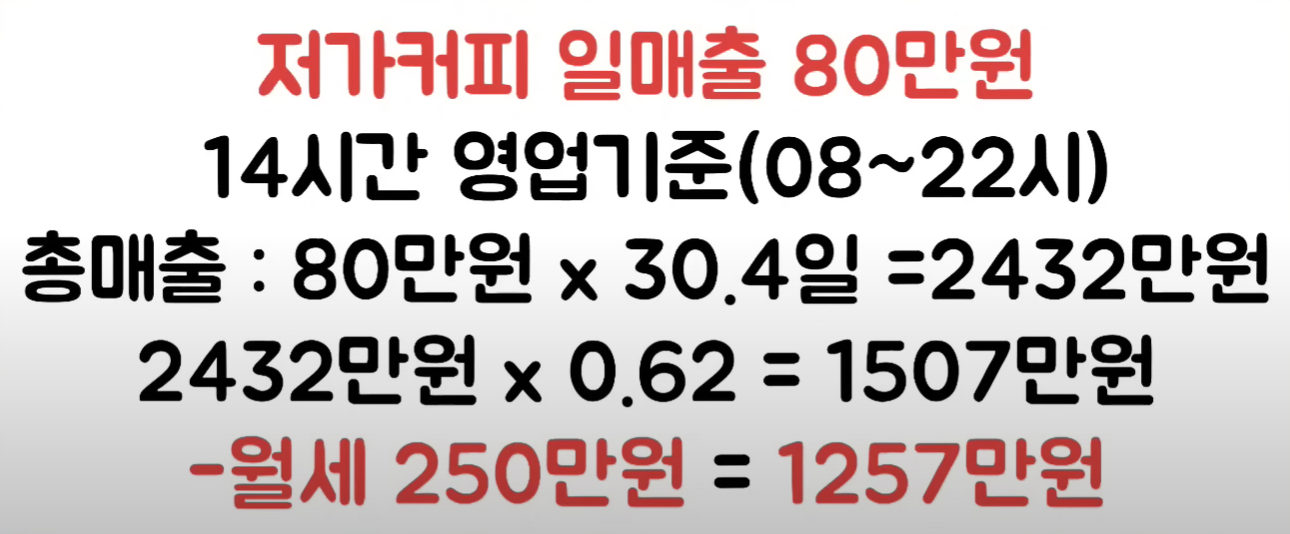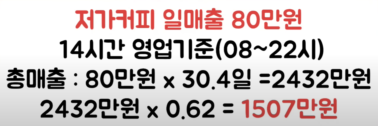 그럼 재료비는 38%로 잡고 계산하면 마진율은 약 62% 정도입니다. 그럼 2,432만 원 X 0.62 하면 1,507만 원이 나오네요. 그리고 여기서 이제 월세를 빼야 되는데요. 보통 저가 커피의경우에는 자리가 굉장히 중요하기 때문에 어느 정도권리금이나 월세를 주더라도 좋은 자리입점하는 경우가 많습니다.