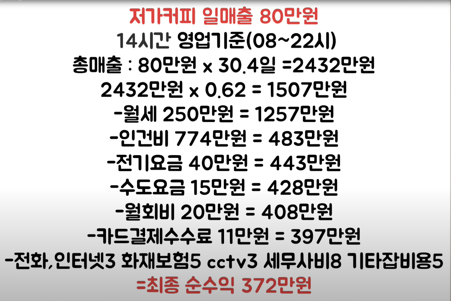 408만 원 - 11만 원 하면 397만 원이 남네요. 자 여기서 매장인터넷 전화 3만 원, 화재보험 5만 원, 세무사비 8만원. 기타 잡비용 5만원 해서 한 달 약 25만 원 차감하면 372만 원 나오네요. 이 372만 원이 주 5일 9시간 일했을 때 메가커피나 컴포즈 커피 같은 저가커피 창업 후 성공해서 일 80만 원 매출을 하루도 빼지 않고 올렸을 때 여러분이 가져가실 수 있는 한 달 순수익입니다.