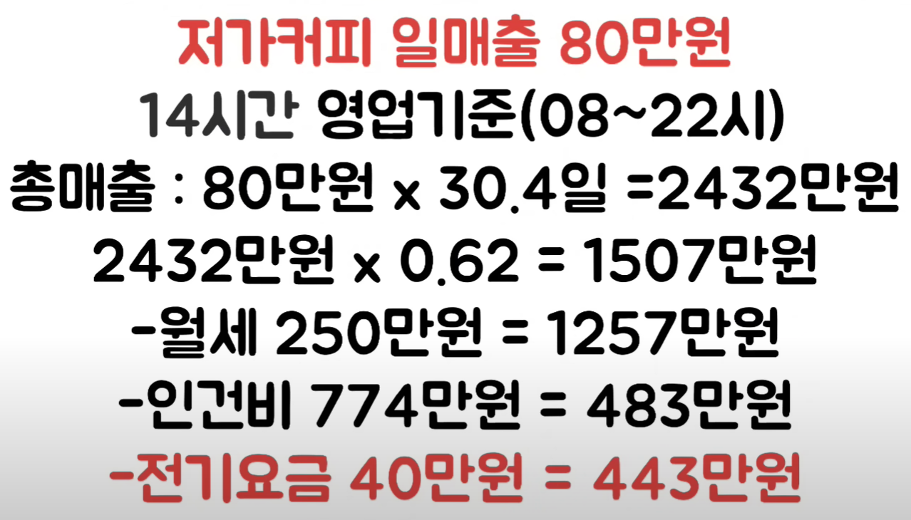 인건비는 15시간 미만으로 쪼개서 알바를 쓰거나 본인이 더 근무할 경우에는 이것보다 더 줄어들 수 있습니다. 그럼 1,257만 원 - 774만 원 하면 483만 원남았습니다. 이제 전기세를 차감해 줘야됩니다. 전기세의 경우 이번 연도에많이 인상이 되어서 12평 점포기준으로 40만 원 정도는 나옵니다. 물론 평수가 크면 더 나오겠죠. 그냥 40만원 정도로 잡고 계산해 보겠습니다. 483만원 - 40만원 하면 443만 원 남았습니다.