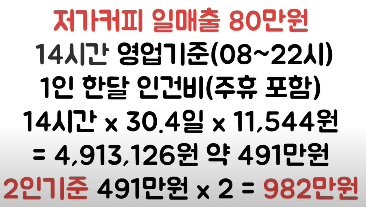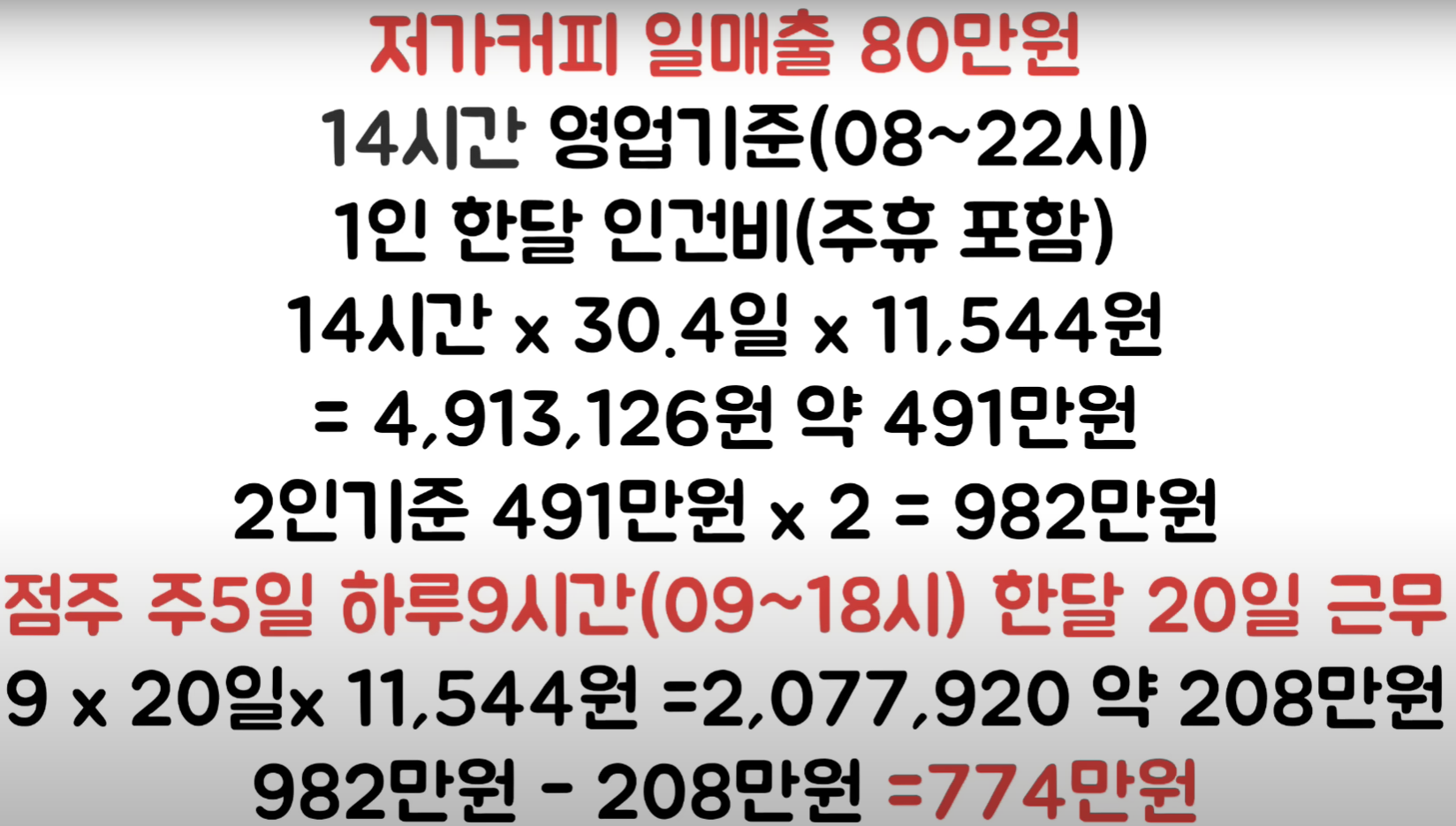 점주가 주 5일 한 달 20일 아침 9시부터 저녁 6시까지 하루 9시간 그동안 근무한다고 계산했을 때 9 X 20 X 11,544원 = 207만 7,920원, 약 208만 원 정도 그럼 본인인건비를 차감해 주면 982만 원 - 208만 하면 인건비는 774만 원입니다.