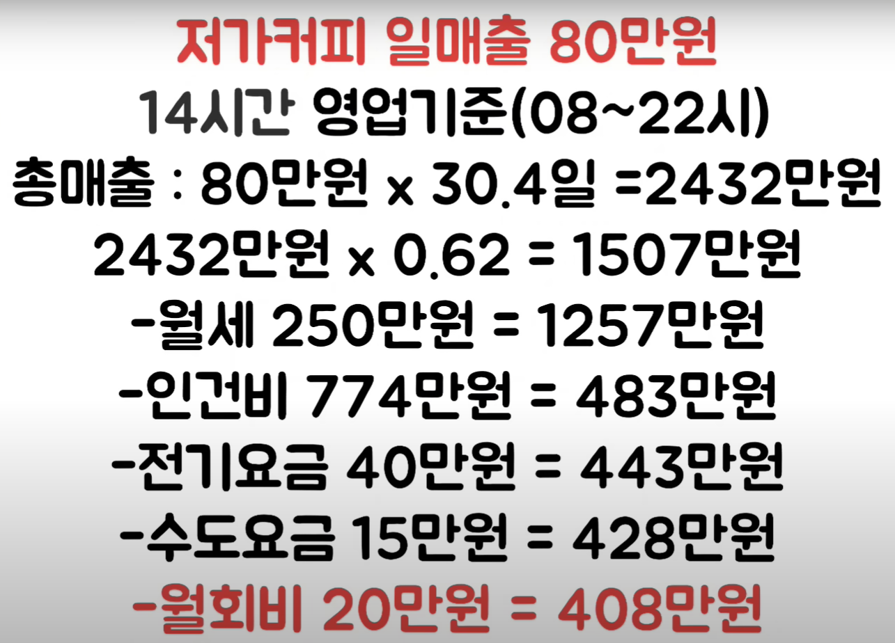 아직 뺄게 더 남았습니다. 수도세 빼야죠. 수도세의 경우에는 한 달에 15만원 정도차감해 주시면 됩니다. 443만원 - 15만원 하면 428만 원입니다. 그리고 월 회비도 있습니다. 메가커피의 경우 현재 한 달 15만 원, 플러스 광고비를 12만 원씩 내고 있고 컴포즈 커피의 경우에는 월 회비 20만 원 고정입니다. 그냥 20만원 정도로 잡아서 428만 원 - 20만 원 하면 408만 원이네요.