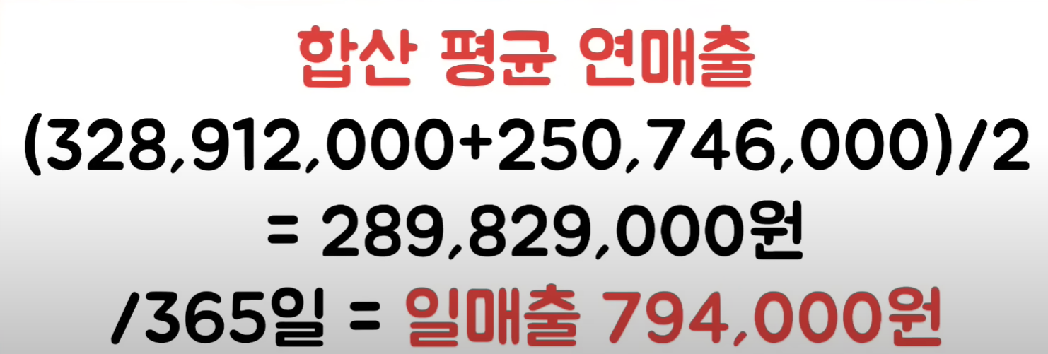 메가커피가 컴포즈커피보다 좀 더 높습니다. 오늘은 이 두 브랜드의 연평균 매출을 합산평균한 금액을 기준으로 잡고 계산을해 보도록 하겠습니다. 합산해서 평균 낸 연평균 매출액은 2억8천8백만원입니다 이걸 일매출로 나누면 794,000원이 나오네요. 그럼 메가커피와 컴포즈커피를 장업해서 성공하면 일 평균 매출을 80만원낼 수 있다고 가정하여 계산을 한번해보도록 하겠습니다.