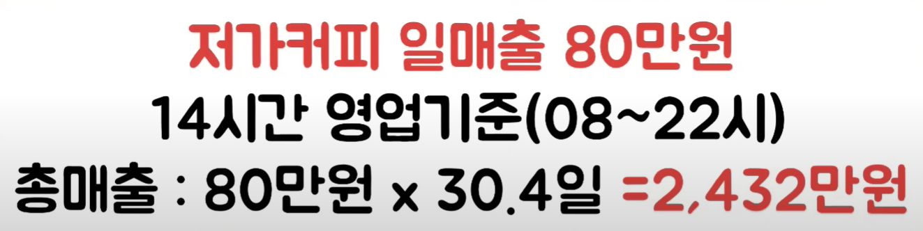 먼저 총매출을 계산해 봐야겠죠. 80만 원 X 30.4에 라면 총매출은 2,432만 원이 나오네요. 그럼 여기서 매출이 전부 이익이 아닙니다. 마진율을 곱해줘야 이익이 나옵니다. 저가 커피프랜차이즈의 경우 보통의 경우에는 재료비를 35% 정도로 잡고 계산을 하는데요. 이것은 최저로 잡은 거고, 점주가 재료 관리를 조금만 못하거나 소홀할 경우에는 38%에서 40% 정도가 나옵니다.