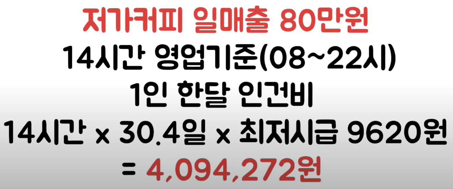 1시간에 7만 원의 매출만 올리려고 해도 혼자서 쉴 새 없이 일해야 됩니다. 1,500원짜리 기준 아메리카노 1시간당 46 잔을 팔아야 되는 금액입니다. 또한 2022년 4월부터 매장 내 일회용 컵이 금지돼서 매장에서 먹는 손님의 경우에는 컵에 따로 나가야 되는데 이것 때문에 중간중간 설거지도 해야 돼서 인건비가 많이 올라갔습니다. 보통 저가 커피의 경우 숙련도에 따라 다르긴 하지만 시간당 7에서 8만 원이 넘어가면 2명이서 일해야 됩니다. 일 매출 80 정도면 상시 2명 정도는 근무를 해줘야 원활하게 돌아갑니다.