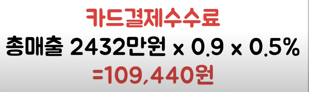 아 그리고 카드결제 수수료도 차감해야 됩니다. 매출이 3억 이하일 경우에 영세가맹점 우드에 행사하므로 신용카드 수수료율 0.5%가 적용됩니다. 이것도 매출이 3억이 넘어가면 1.1%로 2배 뜁니다. 요즘 매출이 거의 90% 이상카드이니 2432만 원 X 90% X 0.5% 하면 10만 9,440원, 약 11만 원이네요.