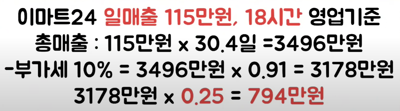 이마트 24는 GS25나 CU와는 달리 상품 마진율이 낮은 편입니다. 그리고 담배 비중이 높은 곳은 마진율이 더 떨어지게 됩니다. 이 기준으로 24~25% 정도면 이마트 24 창업 후 꽤 마진이 잘 나오는 운영에 속한다고 할 수 있습니다. 그럼 마진율 25%를 기준으로 세부계산을 해보겠습니다.