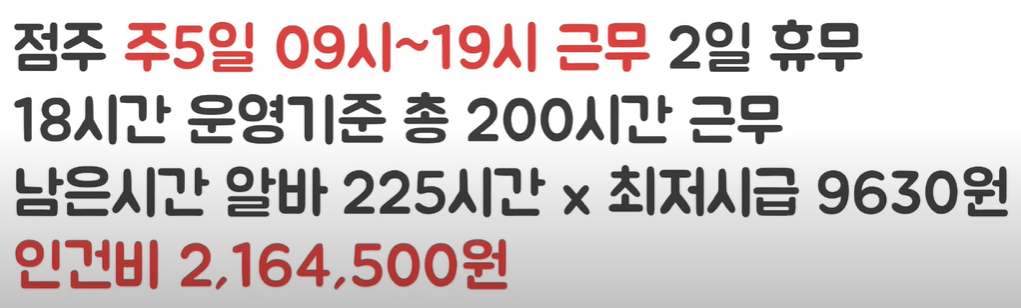 그럼 225시간 X 최저시급 9620원 하면 2,164,500원입니다. 그럼 389만 원에서 216만 원을 빼면 남는 173만 원이 됩니다. 이제 드디어 끝났습니다. 여러분들이 주 5일 하루 10시간은 빼먹지 않고 꼬박 같이 일했을 때 이마트 24 창업 후 하루도 안 빼고 100만 원 매출을 올려야 가져갈 수 있는 한 달 순수익이 173만 원입니다.