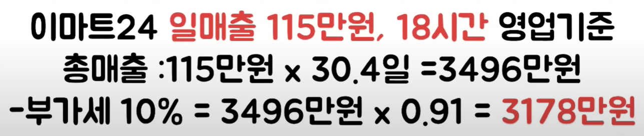 한 달 총매출은 115만원 X 30.4이니 3,496만원이 나오네요. 그런데 이마트24 부가세 포함 매출이기 때문에 부가세 10%를 빼줘야 됩니다. 부가세를 제외한 매출액은 3,496만원 X 0.9가 되니 실질 한달 매출은 3,178만원이 됩니다. 이제 마진율을 곱해서 한달 영업이익을 계산해 보겠습니다.