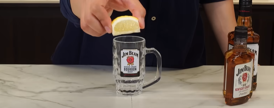 짐빔을 즐기는 첫 번째 방법, 바로 짐빔 하이볼 명가의 하이볼 만드는 법부터 알려드릴게요. 일단 전용잔이 있으면 가장 좋은데요 375mm 전용잔인데 패키징이 아주 귀염뽀짝합니다. 이 잔을 냉동실에 30분 정도 두어 시원하게 만듭니다. 여기에 레몬을 웨지 형태로 잘라서 한번 쭉 짜서 넣어줍니다.