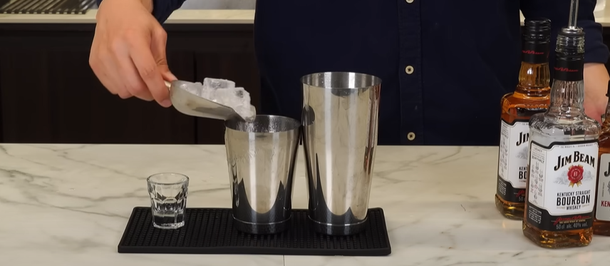 그 위로 얼음을 가득 넣어주고, 짐빔 30ml를 넣어줍니다. 짐빔 전용개량잔이나 지거가 있으면 좋고, 없다면 소주잔 3분의 2 정도를 넣어 주시면 됩니다. 그리고 살짝 기울여서 차가운 탄산수를 잔 벽면을 따라 천천히 채워줍니다. 탄산수를 얼음 위로 부으면 탄산이 날아가기 때문에 꼭 잔 벽면을 따라 부어주세요.