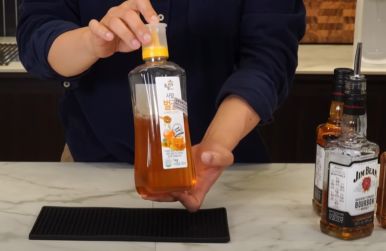 그다음에 골드러시라는 칵테일입니다 이거는 원래 허니시럽이 필요한데 집에는 그냥 꿀 많으니까 오늘은 꿀로 만들어보겠습니다 먼저 약간 따뜻한 물 한 숟가락 정도 넣어주고 꿀을 새 티스푼정도 넣고 꿀을 잘 풀어줍니다. 짐빔 50ml를 넣어주고 레몬즙 20ml를 넣고 얼음 채워주고 쉐이킹을 해줍니다. 잔에 칵테일을 따르면 골드러시 완성입니다. 여기에 레몬 껍질로 가니쉬를 해주면 더욱 보기 좋습니다. 집에 혹시 일반시럽이나 얼그레이 시럽 있으시다면 이런 시럽들을 넣으시는 게 더 맛있긴 해서 제대로 드시고 싶으시면 하나 구입하시는 것도 좋습니다.