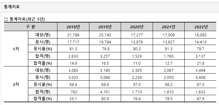1차의 합격률은 평균 21%, 2차 합격률은 48%(2022년 기준)로 1차 시험이 객관식 절대 평가임에도 더 적은 합격생을 내는 것으로 나타났습니다.
