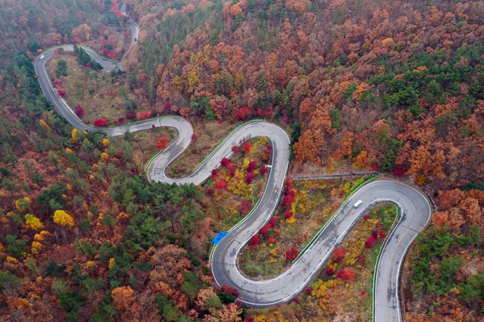 한국 관광공사가 추천하는 단풍 명소는 바로 충북 보은의 속리산 길목에 위치한 말티재입니다.속리산은 원래부터 단풍으로 유명한데, 전망대의 굽이치는 도로를 따라 곱게 물든 단풍을 감상할 수 있습니다. 특히 해질무렵의 노을이 절경이라고 합니다.