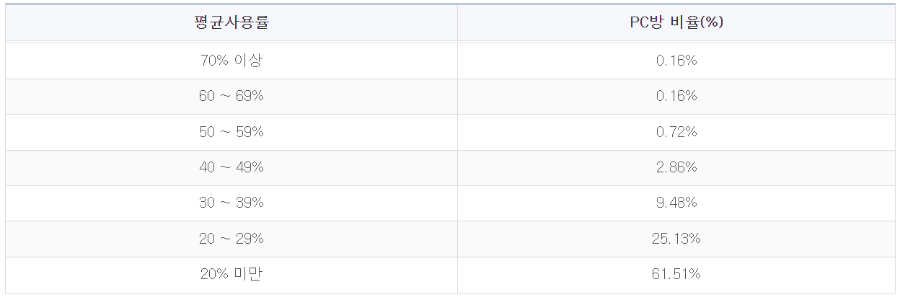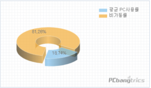 24시간 기준 전 좌석에 사용률이 시간당 약 20% 정도가 사용이되고 있다는 뜻입니다. PC방 프랜차이즈 광고를 보면 평균 가동률이 40%가 넘는다고 광고하지만 전국 평균으로 볼 때 가동률 40% 이상 매장은 3.9%입니다. 100개의 PC방이 있다고 하면 4개도 안 되는 것입니다. 추가로 PC방 매출 중 PC이용료에 의한 매출과 음식 음료 매출의 비중은 약 6대 4 정도입니다.