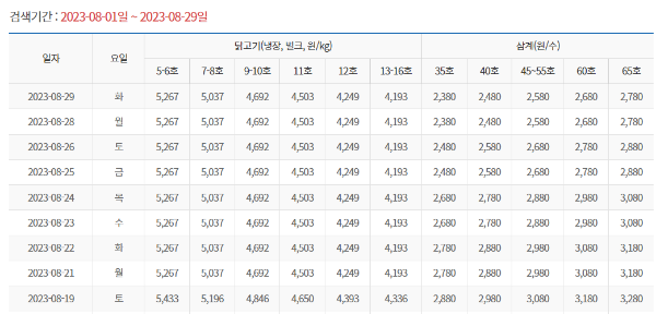 후라이드치킨 가격이 18,000원일 때 가장 큰 원가 비중을 가지는 건 닭 값입니다. 브랜드별로 공급가가 차이가 있기 때문에 한국육계엽회에서 공개한 닭 가격을 기준으로 하겠습니다. 프랜차이즈 치킨집에서 가장 많이 사용하는 9호 닭의 시세는 23년 8월 29일 기준 4,692원입니다. 순살일 경우에는 이 가격보다 비싸기도 하고 프랜차이즈 본사의 유통마진도 고려해야 하기 때문에 1마리당 9호 닭 원가는 6천 원으로 잡겠습니다.