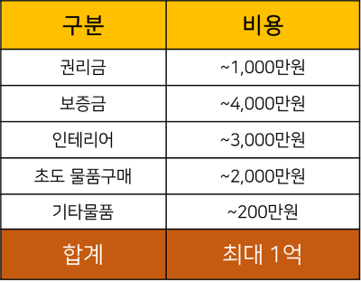 나머지 주요 비용을 포함한 초기 창업 비용은 위와 같습니다. 위 기준으로 보통 8,000만원~ 9,000만원 정도 필요하다 판단하시면 됩니다. 권리금, 보증금은 폐업 시 돌려받는 금액이라 생각하실 수도 있고, 또 비용 자체가 지역과 상권에 따라 크게 차이나는 부분이기 때문에 실질적으로 가장 주목하는 비용은 인테리어비용입니다.