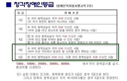 청력력 검사 시 아래에 기준중 5급/6급에 준 할 경우 청각장애인증 발급이 됩니다.