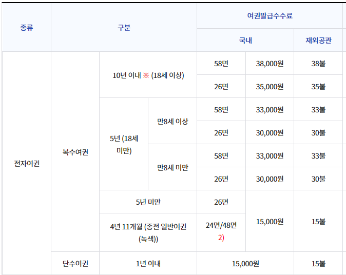 가장 많이 발급받는 성인 복수 전자여권, 5년 유효기간 여권의 경우 58면짜리 3만 3천원, 26면짜리 3만원입니다.