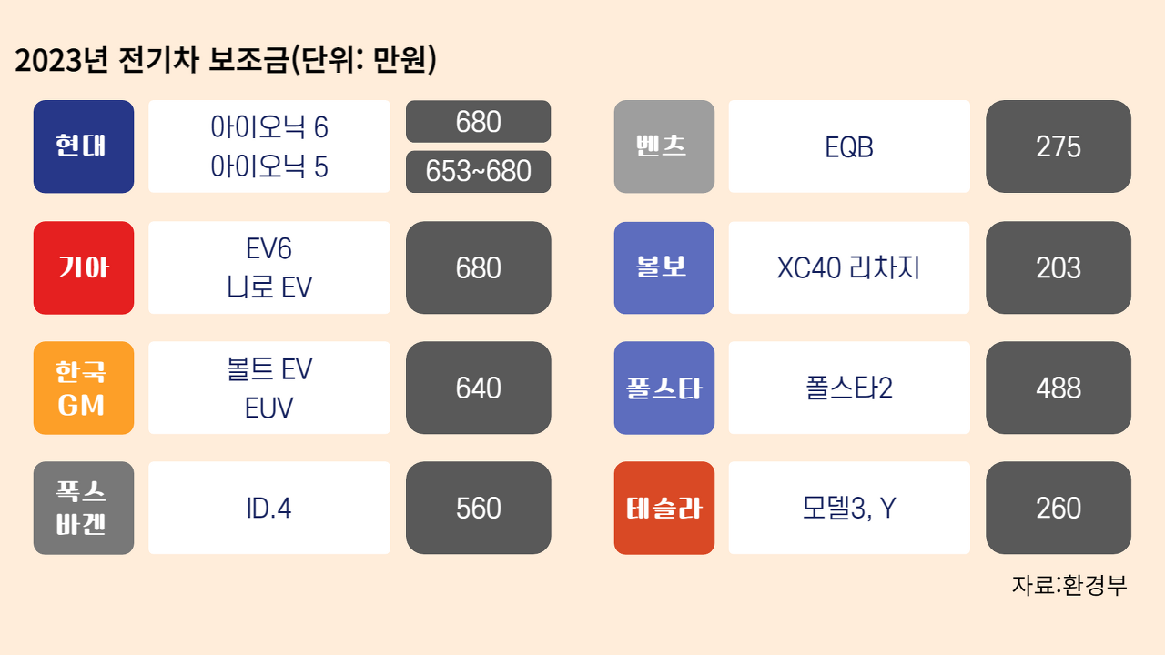 모델별 지원금은 동일하며 타 브랜드와의 전기차 보조금 차이는 다음과 같습니다.